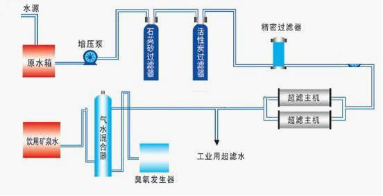 礦泉水水源原水箱原水增壓泵石英砂過濾器活性炭過濾器精密過濾器高壓泵超濾主機(jī)工業(yè)超濾水臭氧發(fā)生器氣水混合器飲用礦泉水